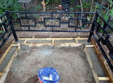 Первым делом мы демонтировали с территории участка кресты и ограждение, параллельно готовя землю к брусчатке. Когда подготовительные работы были завершены мы установили оградке, по низу которой сделали периметр из опалубки для последующей заливки бетоном.